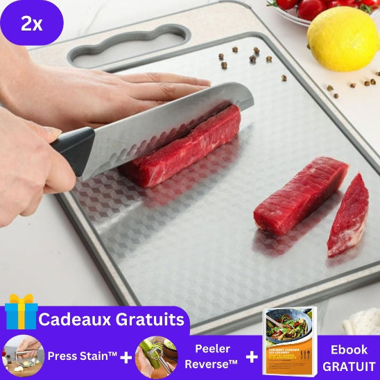 Imaginez disposer d'un outil qui s'adapte parfaitement à chaque ingrédient. D'un côté, l'acier inoxydable résistant aux taches, à la rouille et aux odeurs vous offre une surface idéale pour découper viandes et poissons sans crainte.